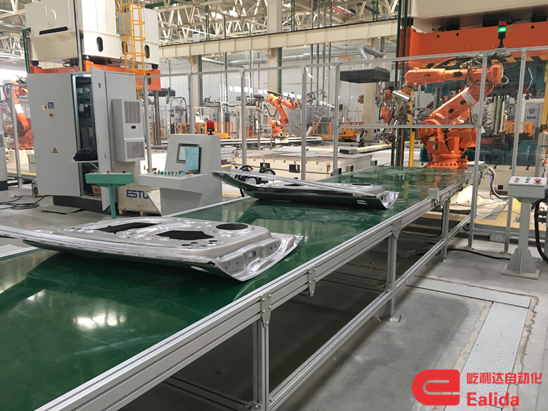 用于承接下料機(jī)器人或下料機(jī)械手放置的工件,并將工件及時(shí)的輸送到線尾。采用變頻電機(jī)驅(qū)動(dòng),設(shè)有自動(dòng)、手動(dòng)操作模式。 a、自動(dòng)模式:零件的出料速度經(jīng)過首次調(diào)節(jié)后,能存儲(chǔ)到相應(yīng)的程序中,今后皮帶輸送機(jī)能根據(jù)零件的相應(yīng)模具編號(hào)自動(dòng)匹配出件速度,當(dāng)出現(xiàn)異常情況時(shí)可以切換到手動(dòng)模式。 ...